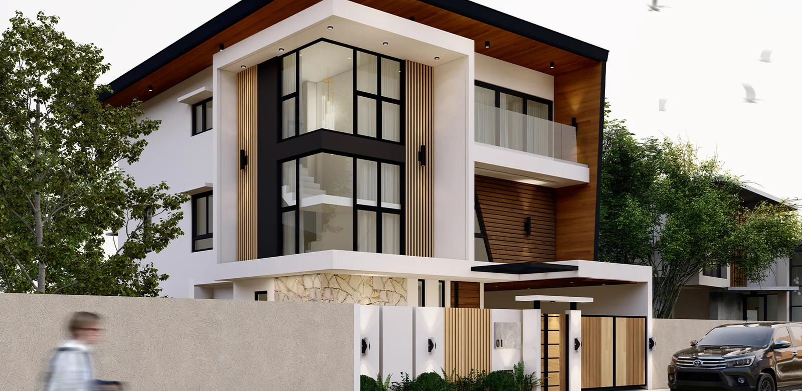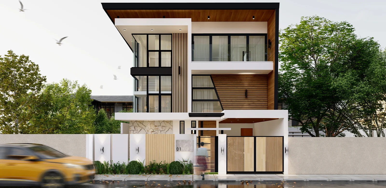 The architects take in this design is minimal yet contemporary; Adding twists of design such as wood claddings and ornaments brings out the best on the rest house total exterior look.